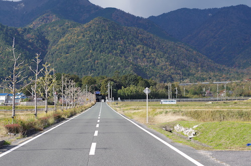 | 駅からの道。つきあたりに雰囲気のある神社があります。 |